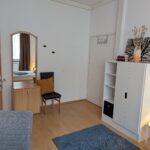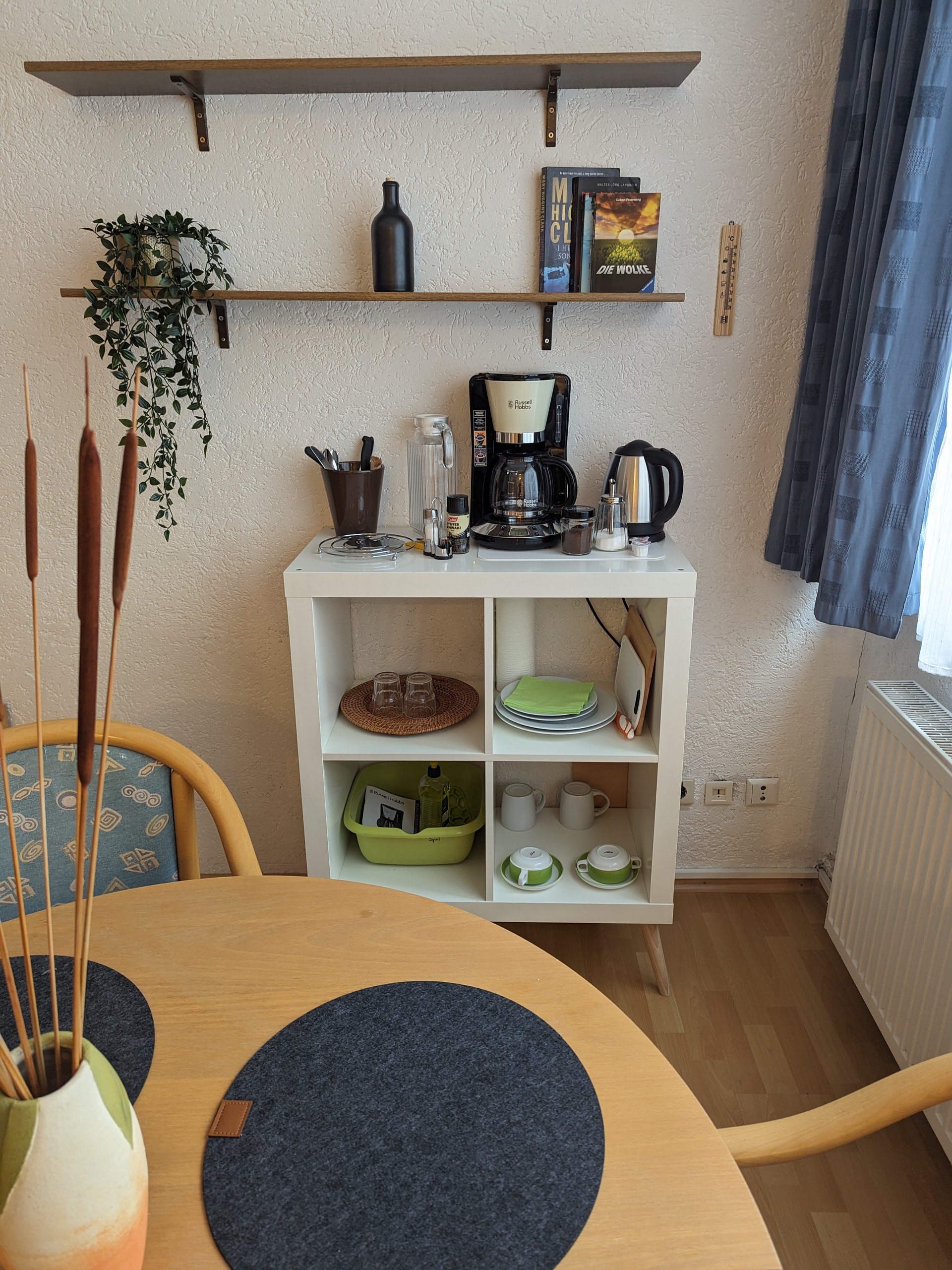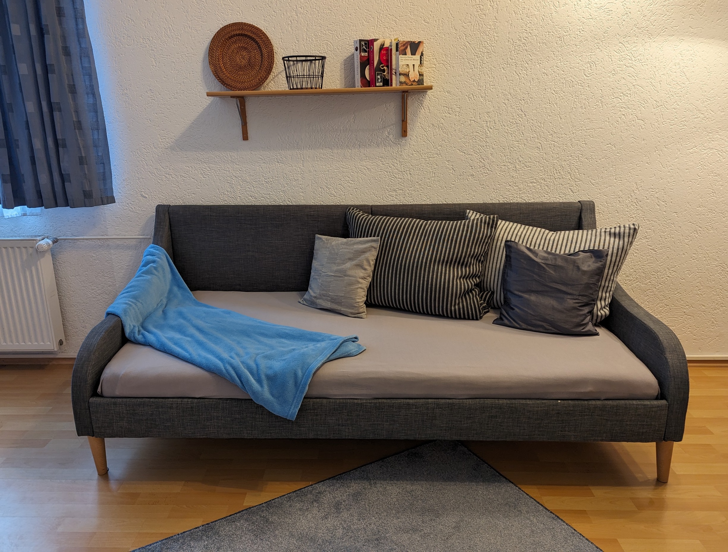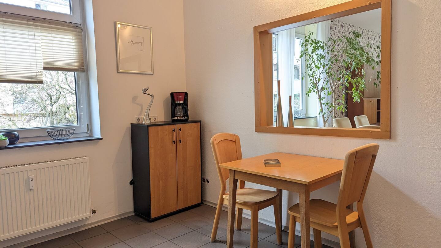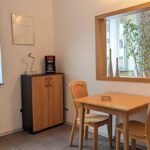 Auf geräumigen 33qm habt ein eigenes Bad, und eine kleine Frühstücksecke mit Kaffeemaschine und Wasserkocher und Getränkekühler. Für Selbstversorger bieten wir gerne geeignetere Unterkünfte mit Küche an. Der Blick vom Fenster geht in den Innenhof. Das Bett ist mit 140×200 Liegefläche für 1-2 Personen ausgelegt, die Matratze ist mittelhart. Das Sofa ist mit 190×200 Liegefläche als Zusatzbett verwendbar. Das Duschbad ist barrierefrei, die gesamte Unterkunft ist mit kleinen Einschränkungen auch für Rollstuhlfahrer geeignet. Belegung für max. 2 Erwachsene + 1 Kind.